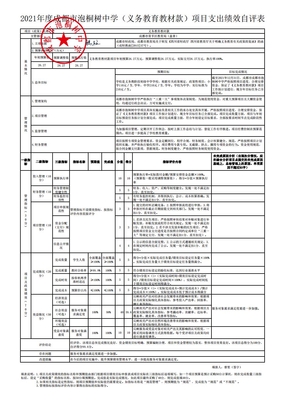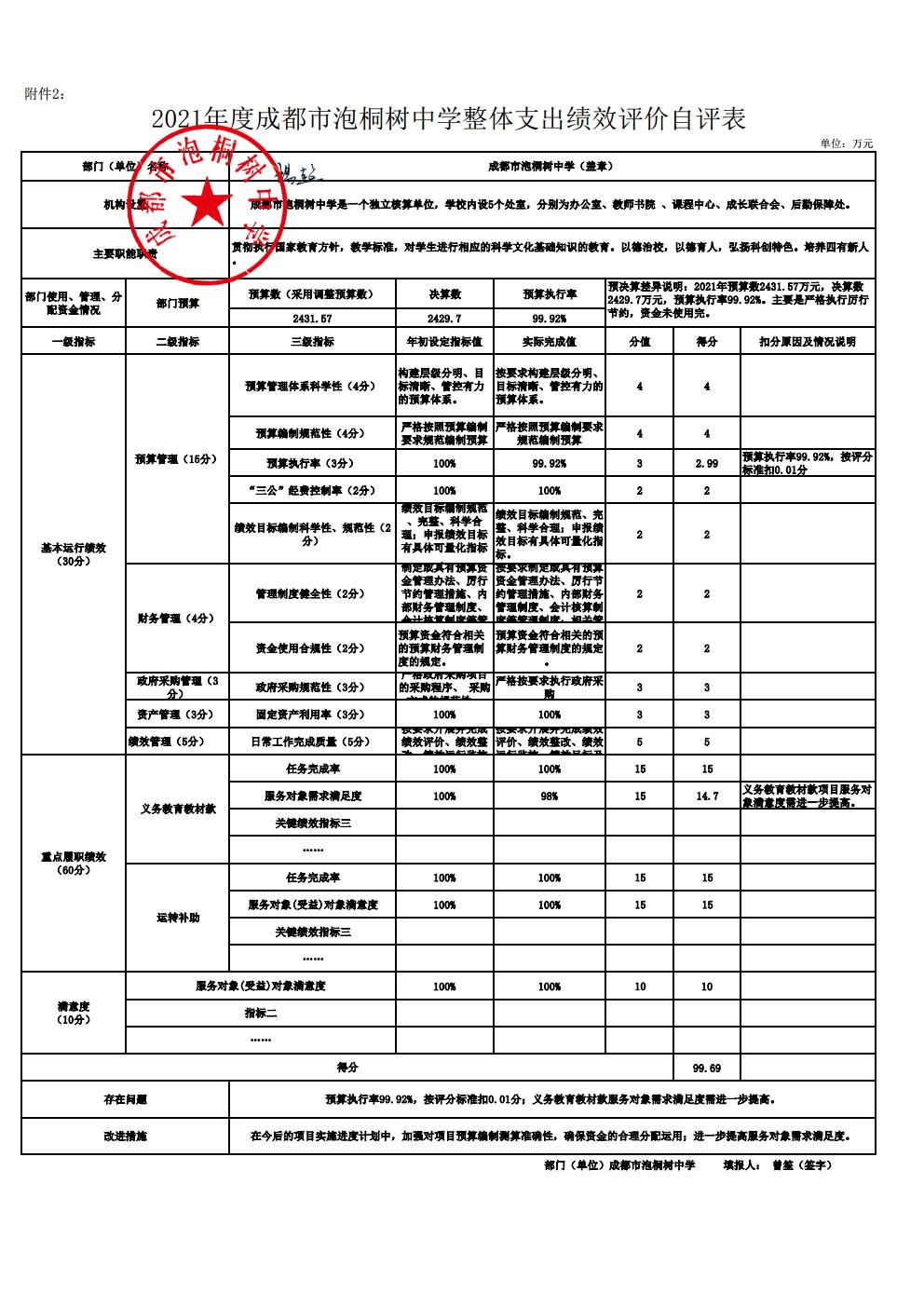 2021年成都市泡桐树中学整体支出评价绩效公示
